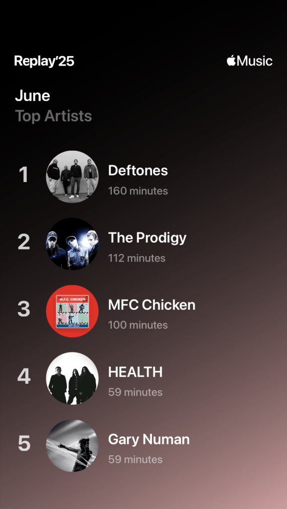 Well I’ve done it again – my top artist is band I was going to see that month, so I listened to them a lot before and after. I was a grungy teenager when the Deftones’ first two albums came out in the 1990s, so I listened to them a lot, bit I never really listened to anything after that. There’s no particular reason for this, they just kind of passed me by. After catching up on their other music and seeing them live in Crystal Palace Park, I have to say that the Deftones are very good! What start as a nu metal band eventually evoked quite a bit into an almost shoe gazing Tool like band, so I pretty much liked everything I was listening to.