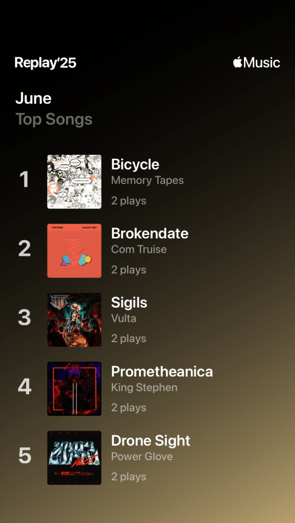 Finally, at number 5 it’s Drone Sight by Power Glove. There is a Power Glove and a Powerglove that I have both listened to quite a bit so this can all get a bit confusing, especially as this song sounds like neither of them! It’s a lot more “dance music” to my untrained dance music ears and not something I’d usually listen to. It’s not even on any of my playlists, so when the hell did I listen to it twice? We’ll never know.