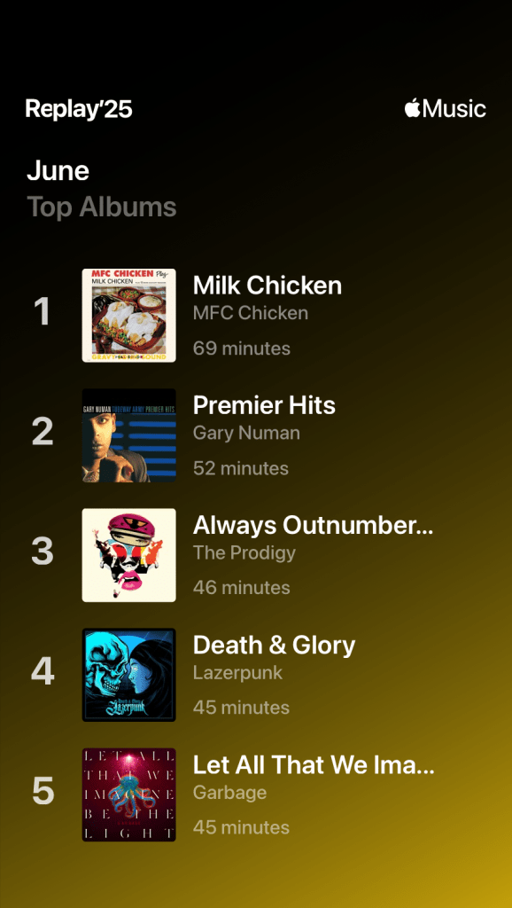 On to the albums, and at number 1 it’s Milk Chicken (2025) by MFC Chicken. This album is more of the same silly and fun garage rock songs about fried chicken that I’d expect from MFC Chicken, but that’s a good thing, I ask for nothing more. I gave it a couple of listens and enjoyed it a lot!