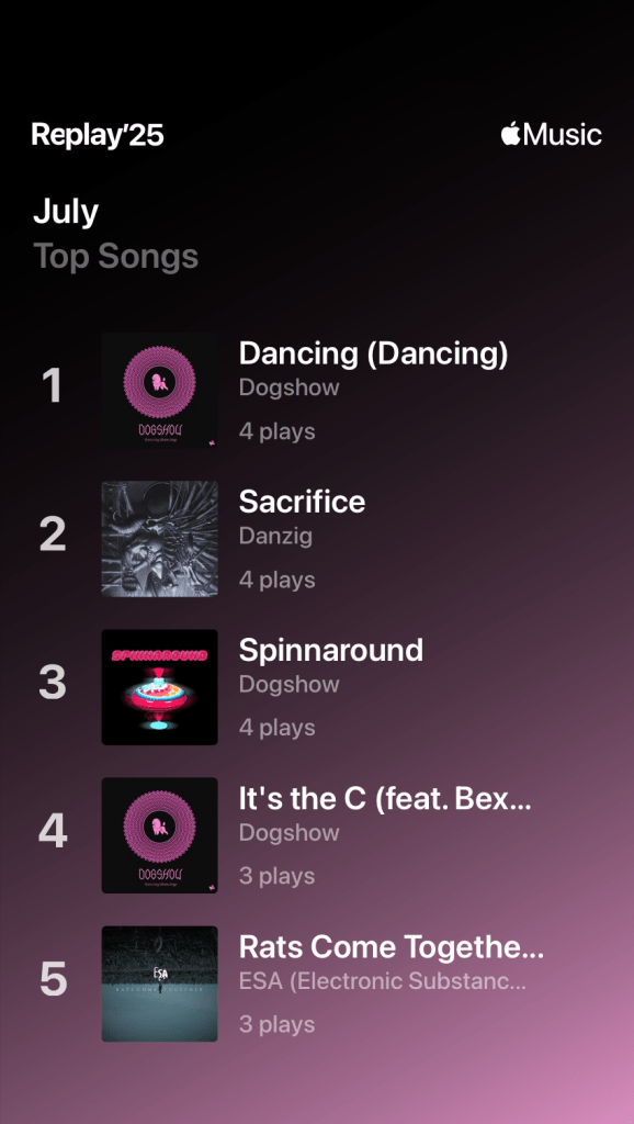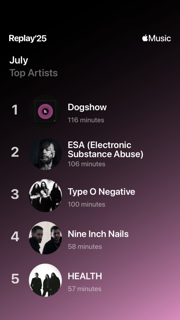 There’s no Dogshow here, but probably only because they don’t have an album! Instead, the top album is Sounds For Your Happiness (2025) by Electronic Substance Abuse. I’ll be honest – I don’t remember too much about the album except that it was noisy and I liked it. I should listen to it again really.