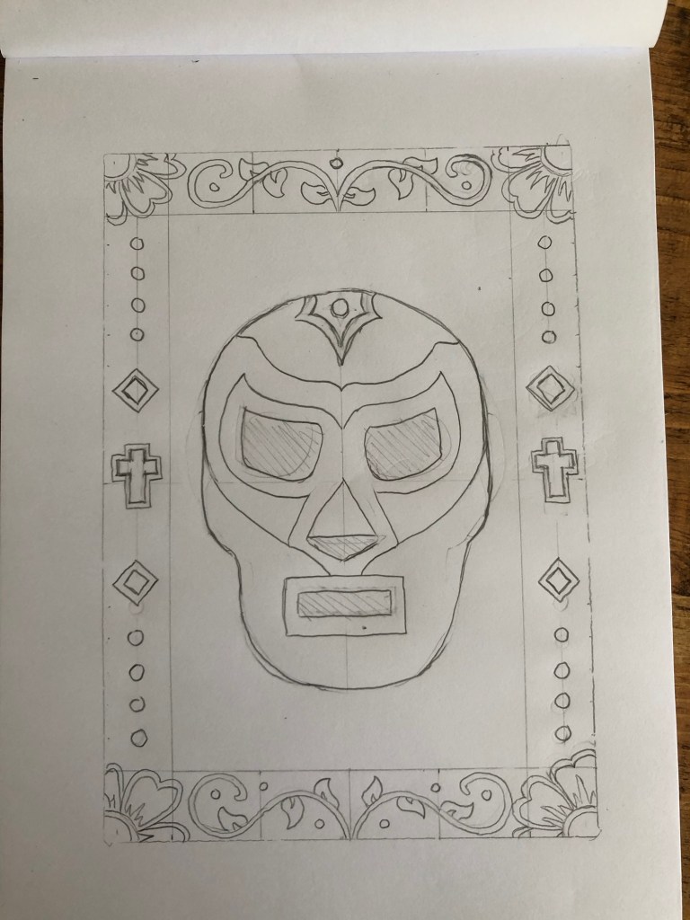 I decided to go for a Mexican themed design centred around a luchador mask and sketched out the design below.