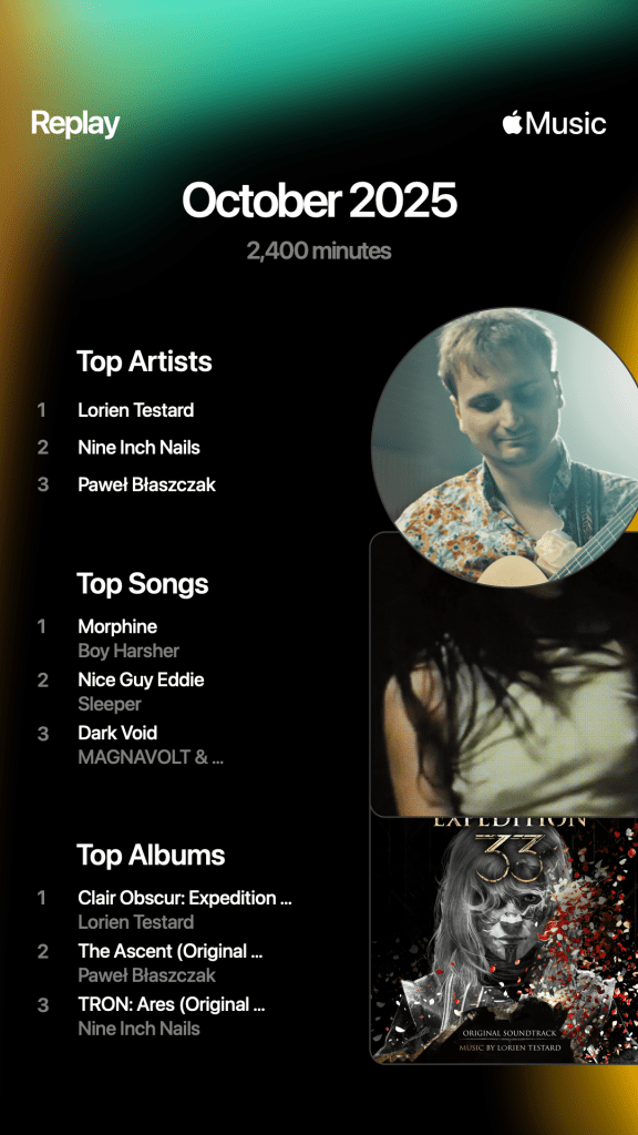 At number one, it’s the Clair Obscur: Expedition 33 (2025) soundtrack by Lorien Testard. This is a video game widely being touted as game of the year. It’s a great game by itself, but everyone is calling out the music as one of the highlights and I have to agree. The game itself is set in the Belle Époque period of France (look that up) and the music really fits the setting. Story wise, a god-like creature is painting a number that decreases every year, and everyone older than that number dies. They are down to 33 so they really need to stop her. Intriguing premise and great game.