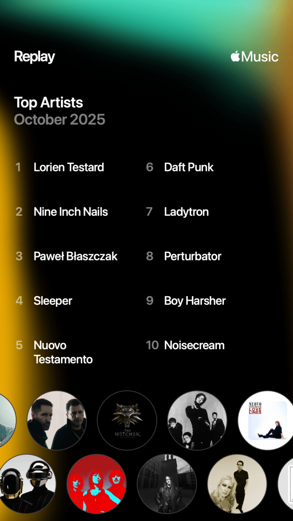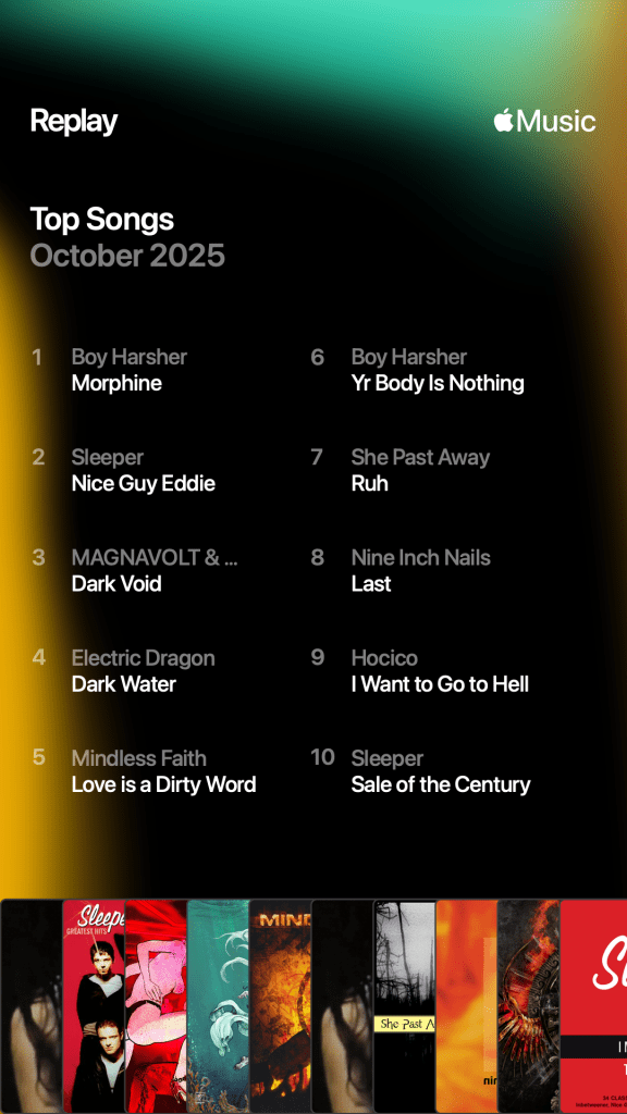I don’t really have much to say about this list except that I didn’t recognise Love is a Dirty Word by Mindless Faith, so I just stuck it on again and it’s some great industrial from 2012 which somehow I hadn’t heard before and I’m not sure how I stumbled across it in 2025.