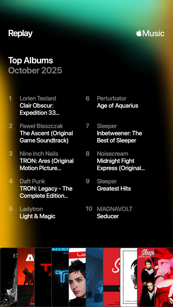 At number 3 is a film soundtrack – TRON: Ares (2025) by Nine Inch Nails. I have never seen, and probably never will see, a TRON film, but I absolutely love NIN so had to give it a listen. A bit more lively than their Ghosts instrumental soundtrack albums, I liked it, but not enough to watch the film.