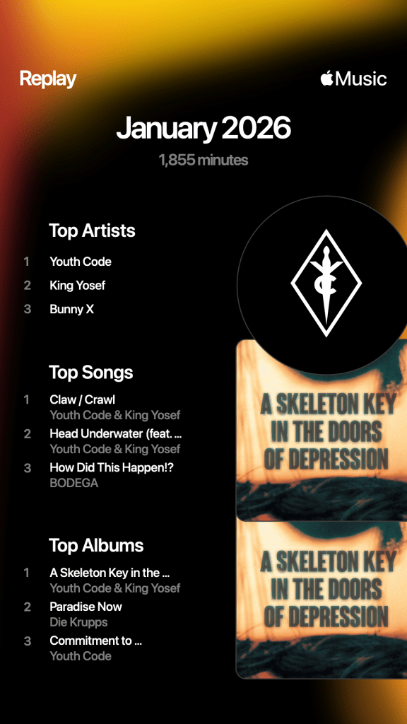 The top 3s this month are all dominated by Youth Code and King Yosemite this month, and that’s because I went to see them both live, at the same gig in Tufnell Park. As usual, seeing bands live made me listen to a lot of their music, including A Skeleton Key in the Doors of Depression (2021), a joint album they released. Quite heavy electronic industrial music, they’re both very noisy and right up my street.