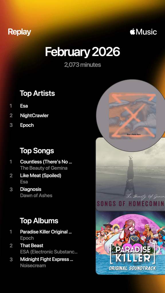 Epoch has got in at number 3 in the top artists because I was listening to the Paradise Killer Original Soundtrack. At first glance, Paradise Killer does not look like the sort of video game I would like to play at all because the artwork and characters are all a bit too millennial/gen Z for a man born in the early 80s. The controls were also a bit odd and took some getting used to as well. BUT… it’s a great game about being a detective solving the murders of gods and it gives you a ton of freedom to solve the case as you wish based on the evidence you find. It also has a cracking synthpop soundtrack.